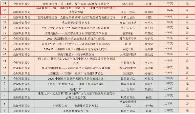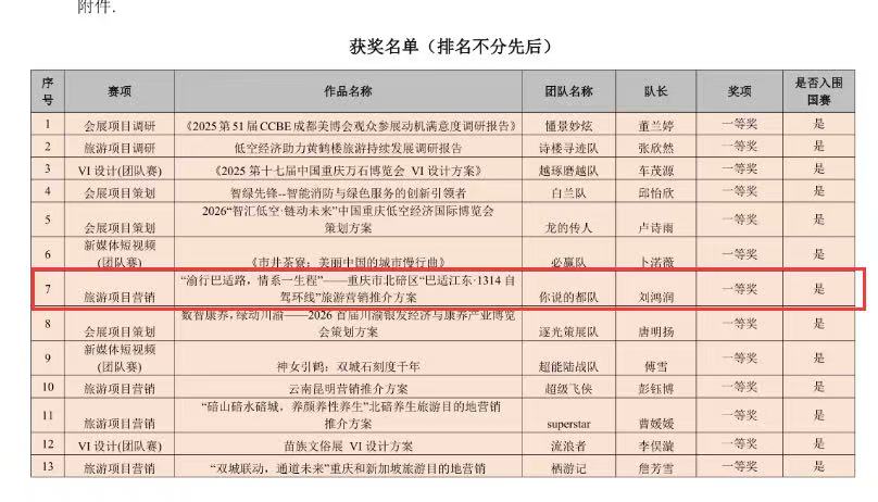 近日,第十九届全国高校商业精英挑战赛文旅与会展创新创业实践竞赛重庆赛区圆满落幕。经过校赛、市赛的层层选拔与激烈角逐,我院学子在旅游项目营销、酒店项目策划赛道表现突出,参赛作品《“渝行巴适路,情系一生程”——重庆市北碚区“巴适江东·1314自驾环线”旅游营销推介方案》与《林深烽烟·山城荣光——南山1898民宿主题营销活动策划方案》双双斩获一等奖,成功晋级全国总决赛。