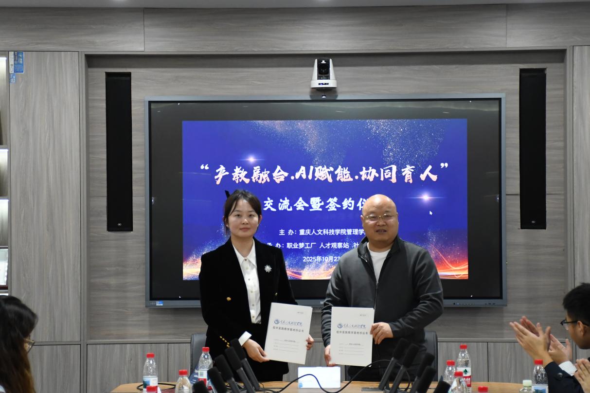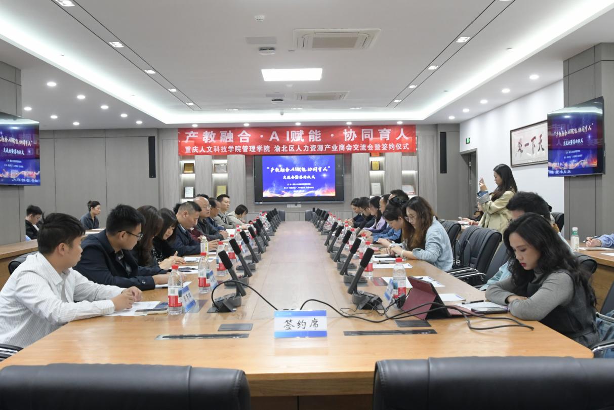 为深化产教融合、探索AI时代应用型人才培养新路径,10月23日,学院举行“产教融合·AI赋能·协同育人”交流会暨签约仪式。重庆人文科技学院校长助理双海军出席会议,渝北区人力资源产业商会、沙坪坝区西站商会及其旗下重庆宜嘉智慧物业服务有限公司、重庆渝之眼文化旅游发展有限公司、重庆方郡建设工程咨询有限公司等十余家企业负责人以及管理学院党政领导班子、教师代表、学生代表参加交流。会议由管理学院院长邓旭升主持。