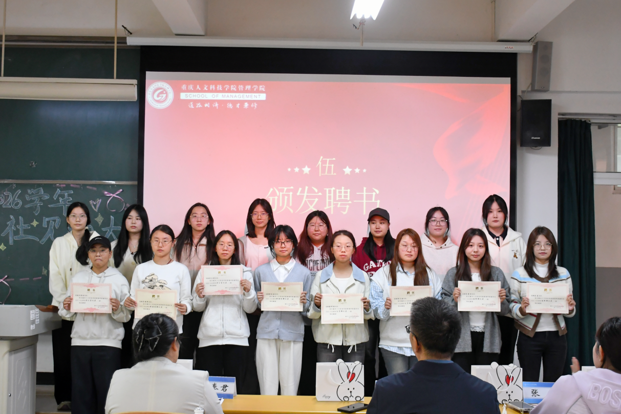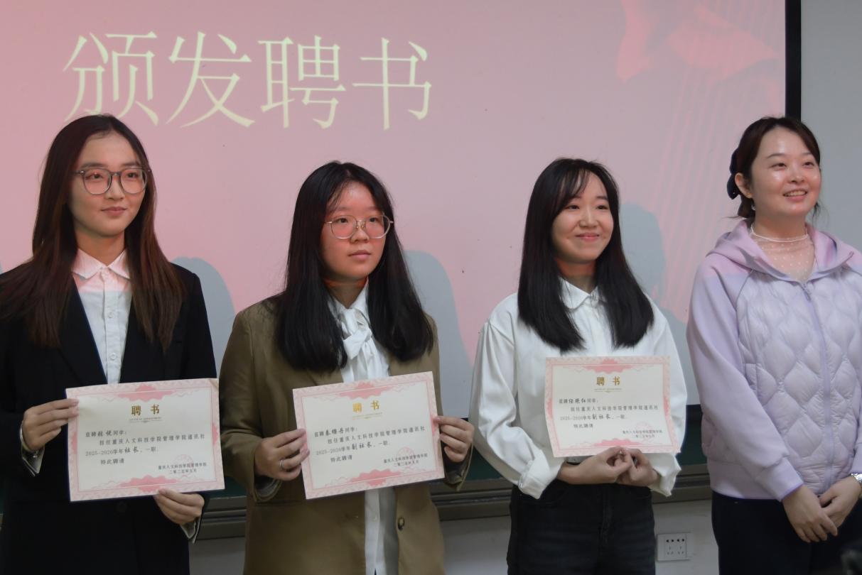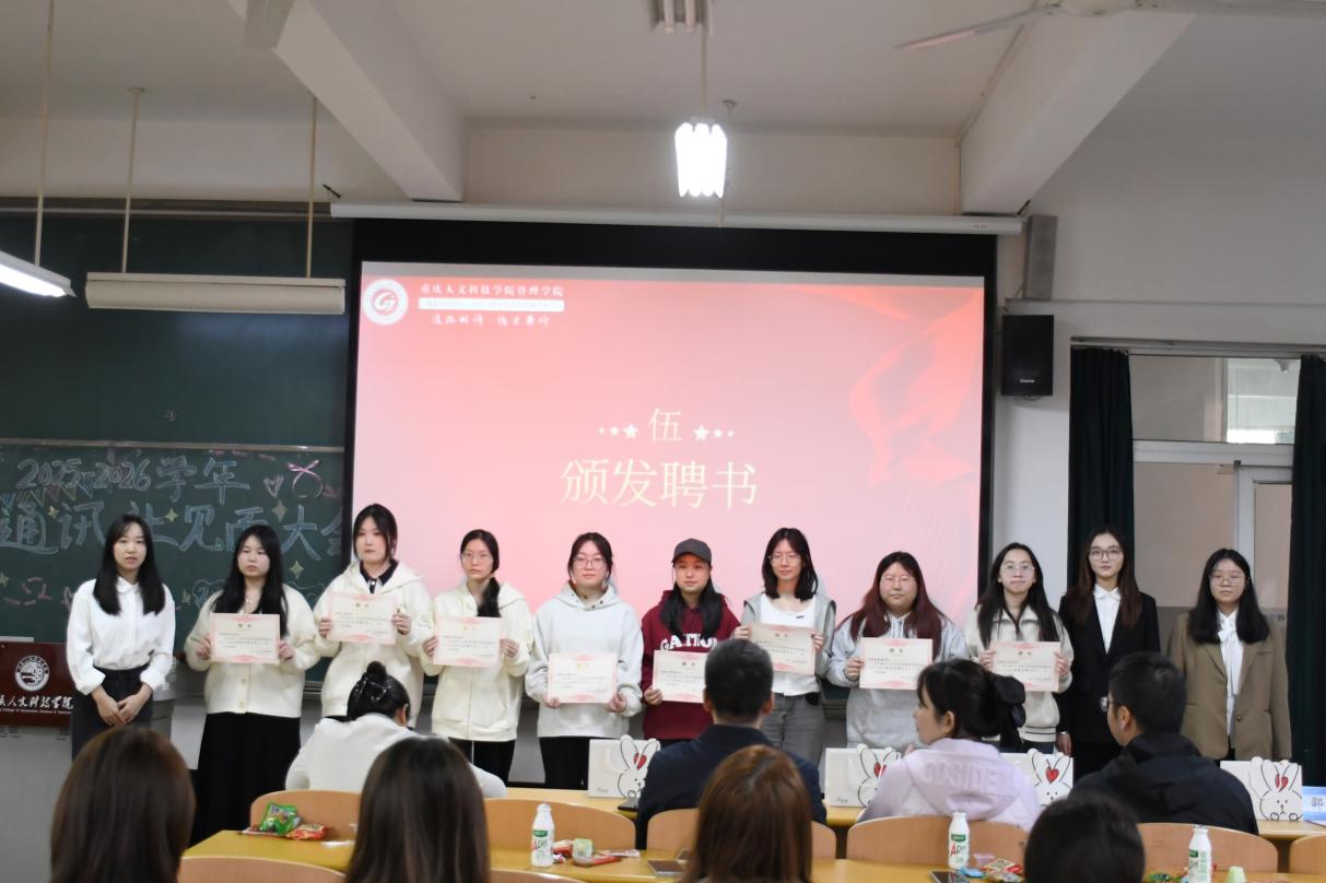 聘任环节,保阳宣读新一届通讯社成员名单,张倩为新任社长、副社长颁发聘书,并寄语新一届团队勇于担当、携手前行。随后,社长、副社长为各部门负责人颁发聘书,各部门负责人再为社员代表授予成员证书。聘书的传递,不仅是一份信任的延续,更是一份责任的接力,象征着新一届团队的启程与使命。