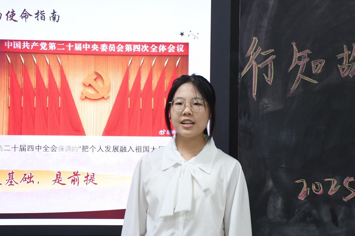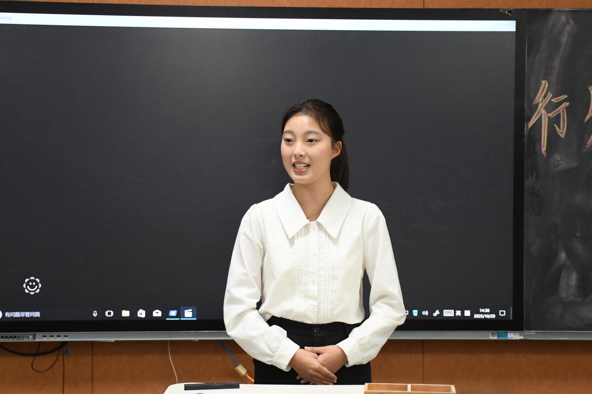 陈梦丹以《团圆阵里的“知行合一”》为题,从最初把“知行合一”视作抽象理论,到在“三下乡”活动中为乡村儿童讲“三防”安全课的转变,分享了“行不必惊天动地,平凡亦能温暖人心”的体悟。她结合家人互助的小故事,阐释“知是行之成”的真义。