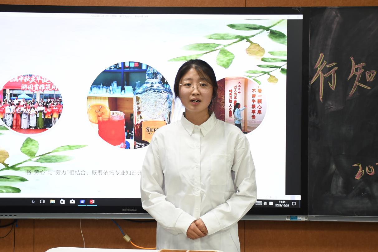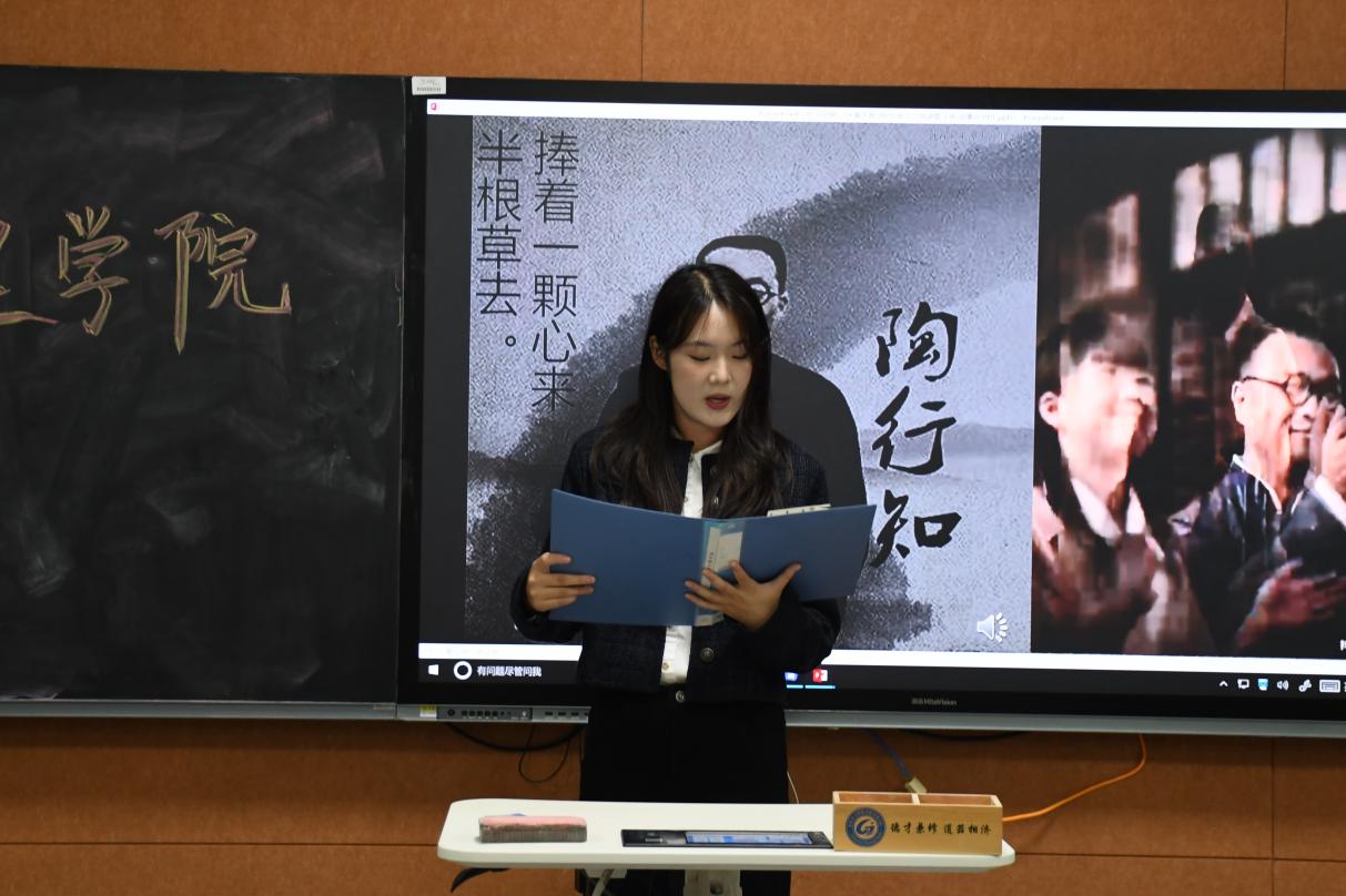 黄宇茜以《秉承行之初心,做时代新人》为题,从陶行知“捧着一颗心来,不带半根草去”的教育情怀出发,结合建筑学专业“走出校园绘蓝图”的案例,倡导师生打破课堂与社会的壁垒,让教育回归生活,让知识照亮实践之路。