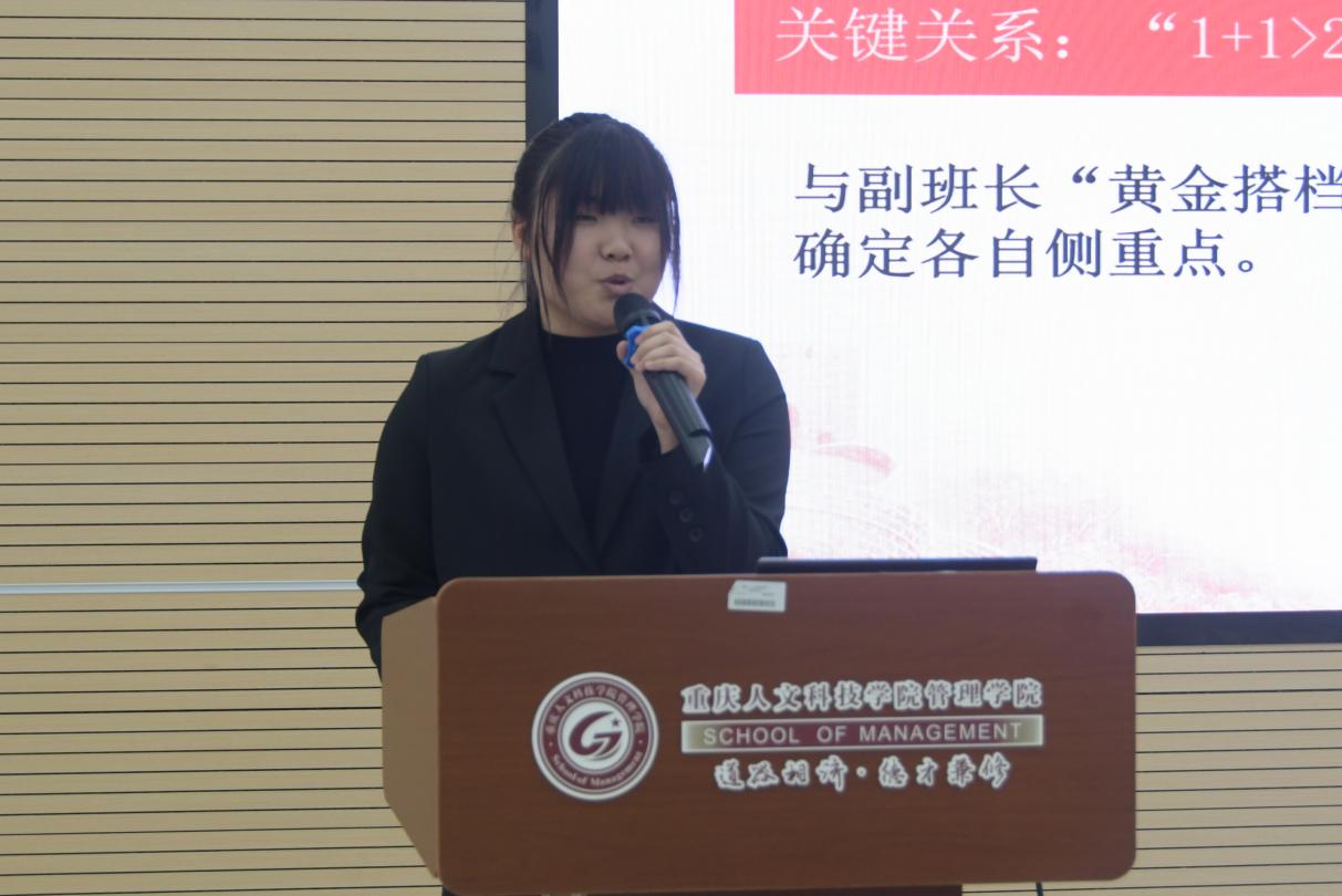 供应链管理2班团支书庄月娇聚焦“双职赋能共治成长”,从治理架构、学风建设、素质拓展、制度创新、未来规划五维度汇报实践成果。她介绍,班级通过“双职统筹+三元布置”架构实现“思想+事务”双轮驱动,以“两学三抓四促”体系推动学风提升;依托“专业实践+红色服务”拓展矩阵,累计获国家级竞赛奖项1项、市级3项、校级多项,班级获评“院级班风一等奖”,其创新的“积分制管理”实现班级从“被动管理”向“主动管理”的转变。
