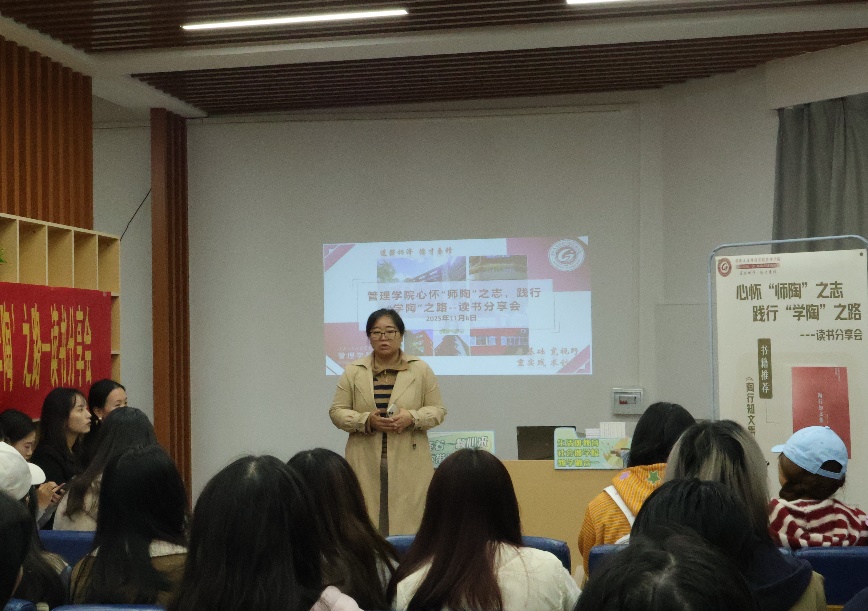 分享会最后,蒋奉君副书记充分肯定了同学们的学习成果,她强调:“行是知之始”,鼓励同学们将学习成果运用到实践中,投身班级、建设楼栋、提升自我,并表示,管理学院将持续推进“心怀‘师陶’之志,践行‘学陶’之路”系列活动,希望同学们积极参与其中,努力成长为不负时代、不负人民期望的新青年!