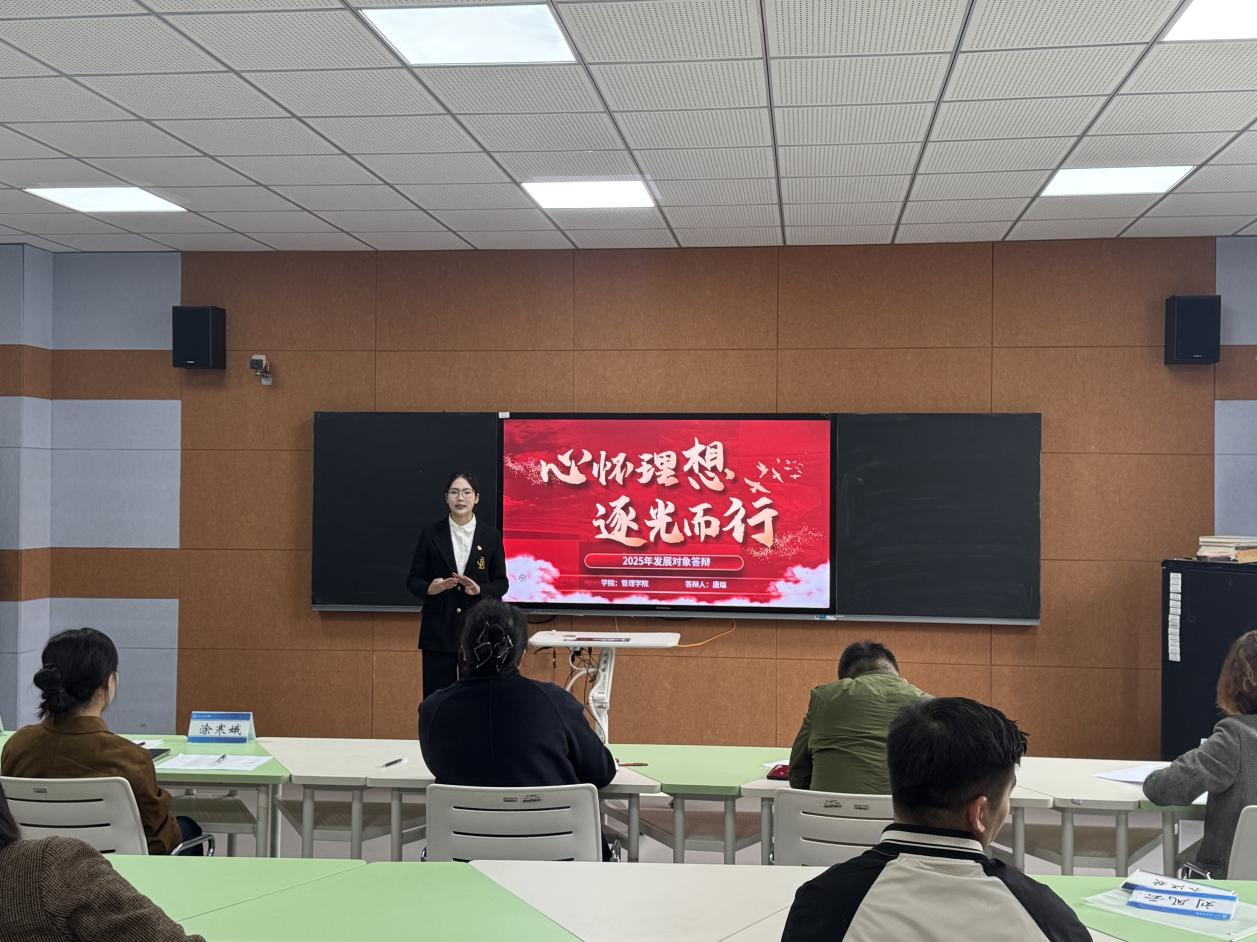 本次答辩分为个人陈述、理论作答和现场问答三个环节,全面考察8名发展对象的个人情况、政治素养以及综合表现。答辩现场庄重有序,发展对象精神饱满,围绕入党动机、思想成长、学习工作实绩及未来规划展开详细陈述。他们畅谈了在理论学习中对党的宗旨使命的深刻领悟,分享了在志愿服务中践行奉献精神的暖心故事,讲述了在学生工作中攻坚克难的责任担当,用真实经历展现了新时代青年向党组织靠拢的坚定信念与昂扬风貌。在现场问答环节,评委结合发展对象的陈述和理论作答情况进行提问,引导发展对象深化理论认识、强化责任担当。