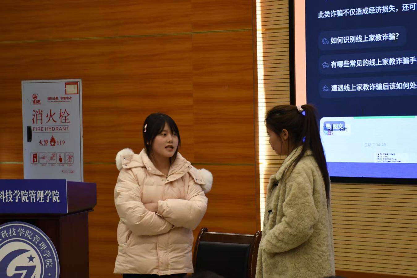 决赛环节中,10支队伍依次登台,从校园返利诈骗、AI换脸诈骗、征信注销骗局、“杀猪盘”情感诈骗、虚假投资理财、冒充客服退款等高频诈骗行为入手,以严谨逻辑剖析诈骗链条、情境演绎识骗过程,并提出“陌生链接不点、来电号码必核实、转账信息须确认”等可操作性策略。参赛队伍以真实案例为依据,构建了“识别陷阱—追溯逻辑—提出方案”的分析路径,体现了管院学子敏锐的风险洞察能力与强烈的公共安全意识。