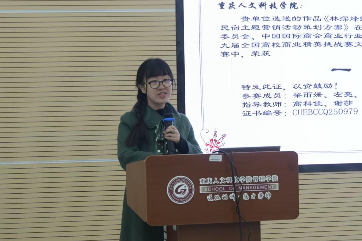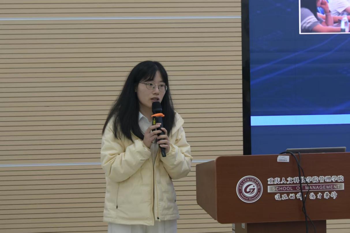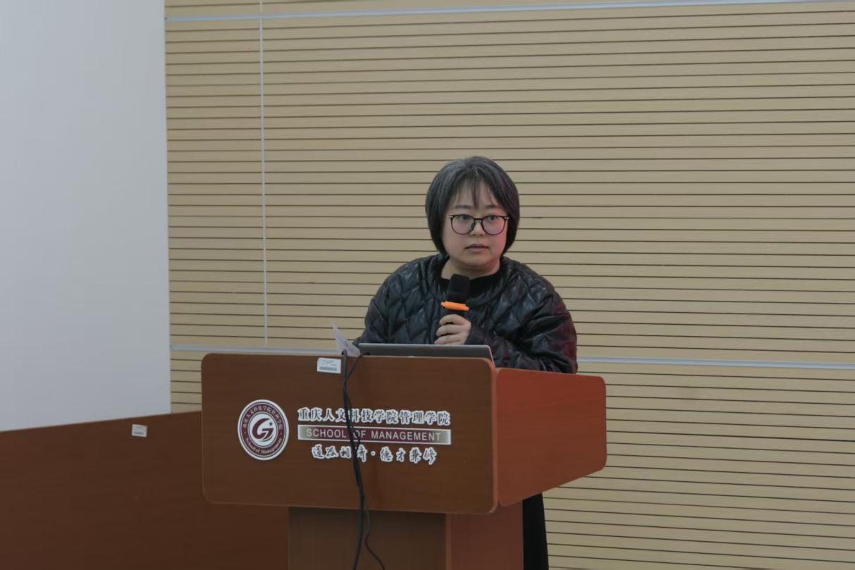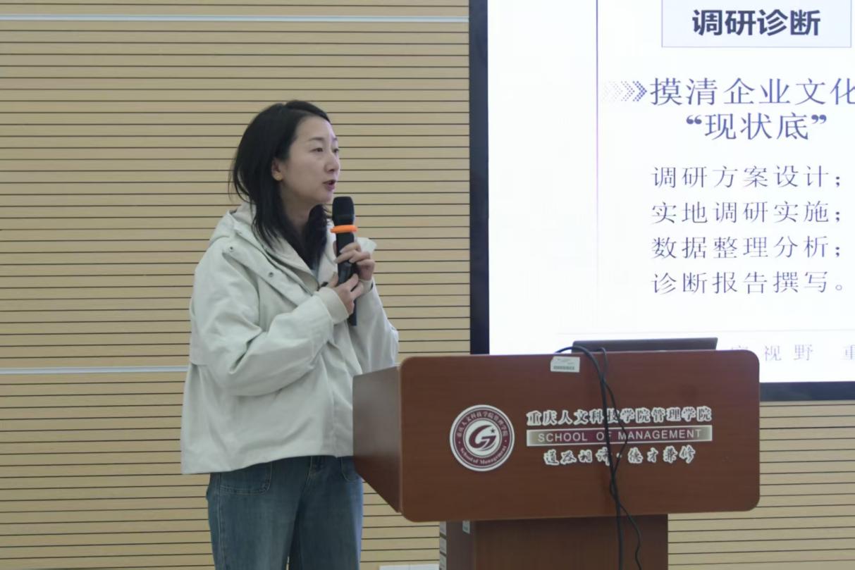 贺幸带来《习文乐见,以智为伴——〈企业文化〉课程创新实践》汇报,她将AI技术融入课程设计,通过案例智能分析、情境模拟体验等方式增强课堂体验感与学习思辨度,拓展企业文化教学的深度与温度。
