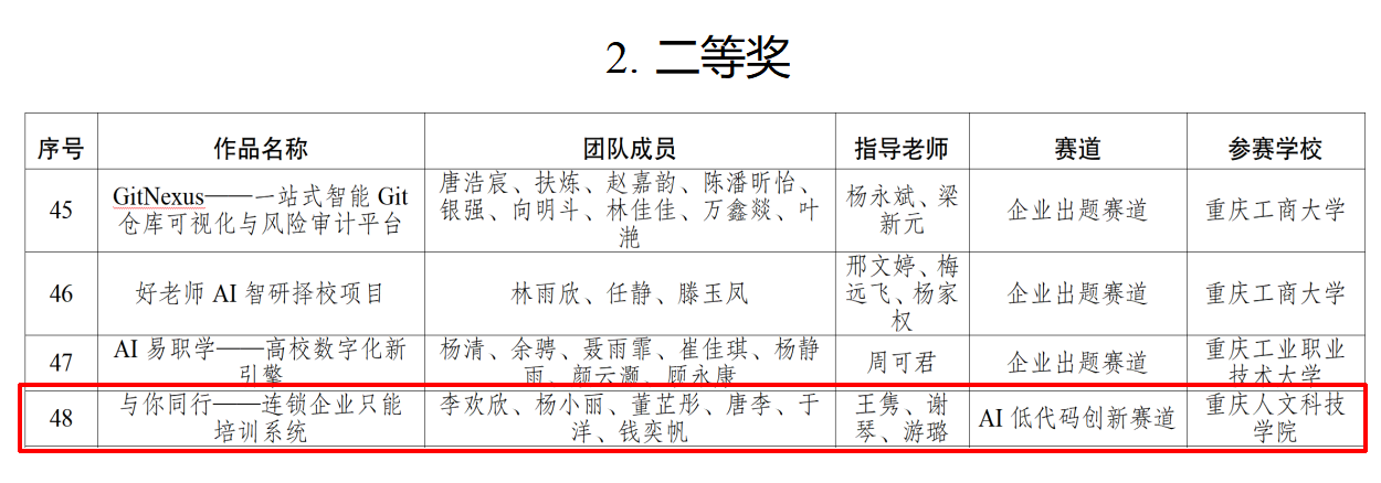 学院参赛团队在作品设计中展现出敏锐的问题洞察能力和优秀的技术整合能力,将AI低代码开发与实际业务逻辑深度融合,形成了具有创新性与应用价值的解决方案,赢得评委一致认可。该项佳绩不仅彰显了学院学生扎实的专业基础与创新能力,也体现出学院在推动人工智能教育融入专业建设、深化学科交叉融合方面的积极探索与阶段成果。