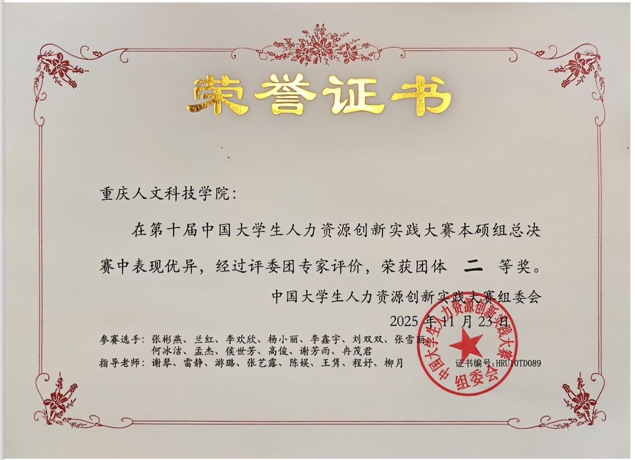 2025年11月21日至23日,由中国人才交流协会、中国劳动关系学院、国投人力资源服务有限公司联合主办的第十届中国大学生人力资源创新实践大赛(HRU)全国总决赛在北京中国劳动关系学院圆满落幕。我院人力资源管理专业学子凭借扎实的理论基础、突出的实操能力和创新性的解决方案,在来自全国119所高校、千余名参赛者的激烈角逐中脱颖而出,荣获全国总决赛团体二等奖,并斩获单项赛道一等奖2项、二等奖5项。谢琴、雷静、游璐、张艺露、陈娱、王隽、程妤、柳月8位指导教师获评“优秀指导教师”称号。