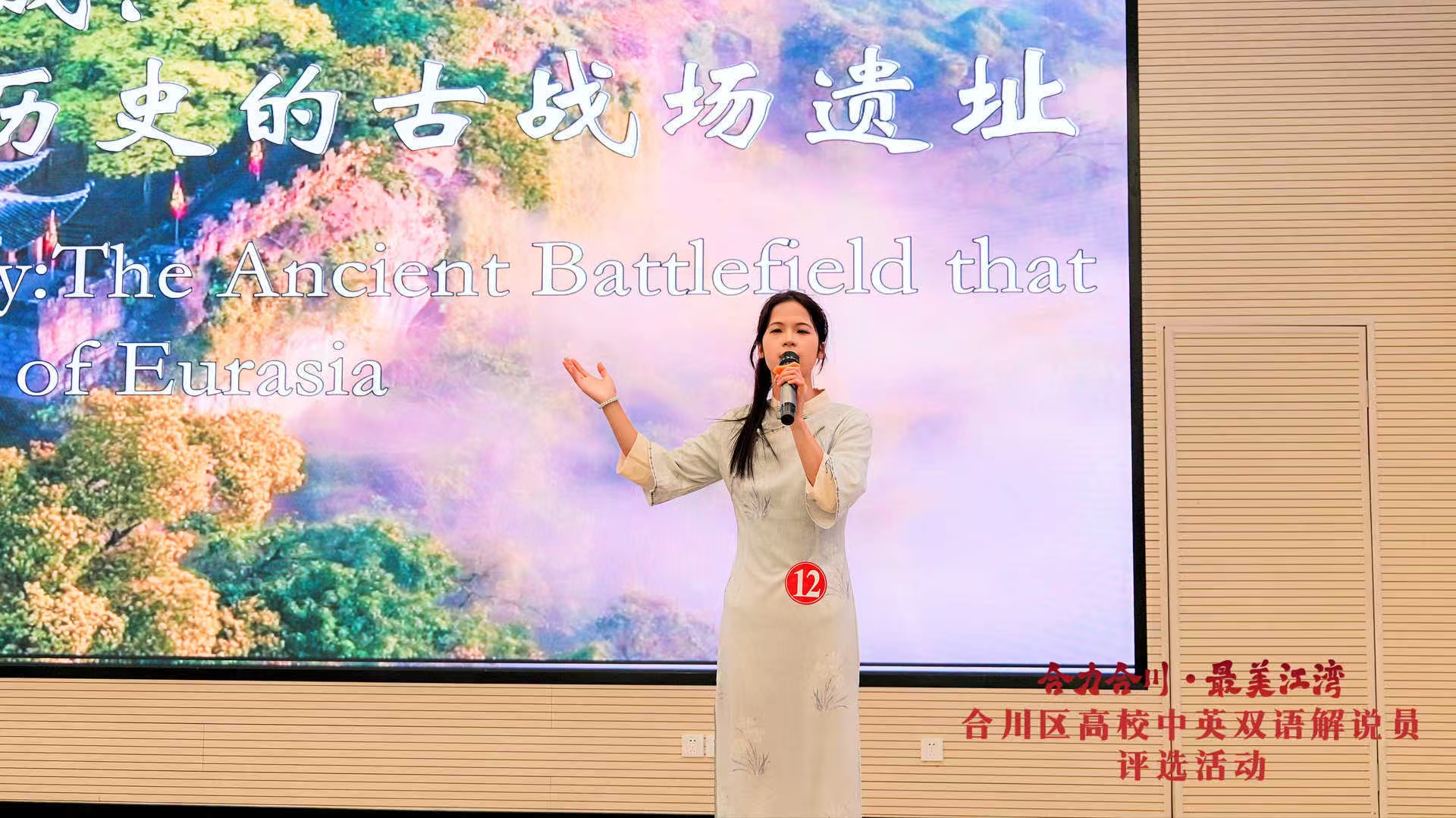 围绕卢作孚故居与钓鱼城两大文化地标,参赛选手通过实地调研、史料梳理与双语文本反复打磨,将历史叙事与语言表达有机融合。比赛中,选手以清晰的逻辑结构和稳定的双语表达,讲述合川先贤精神与历史风云,在有限时间内完成了对地域文化的立体呈现,获得评委与现场观众的积极评价。备赛与参赛过程中,选手不断对照专业标准查找差距,在交流互鉴中拓宽了文化传播视野。
