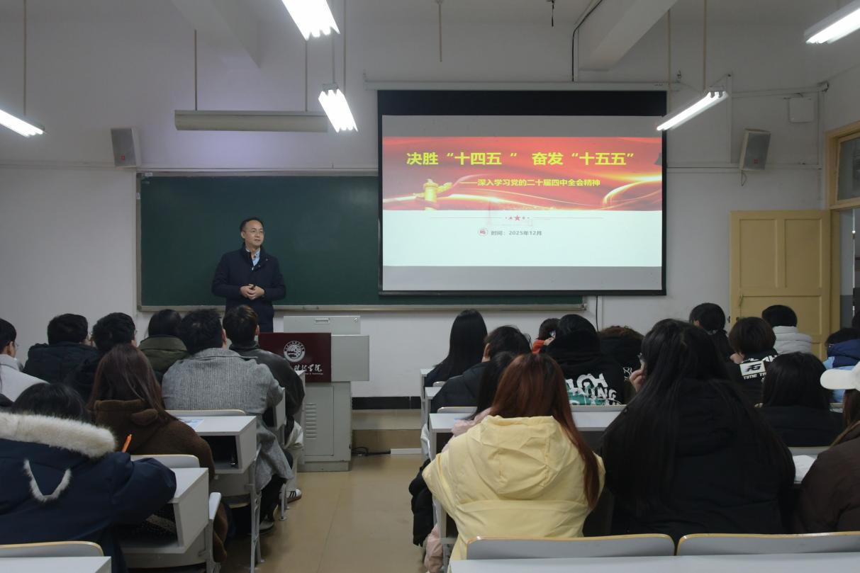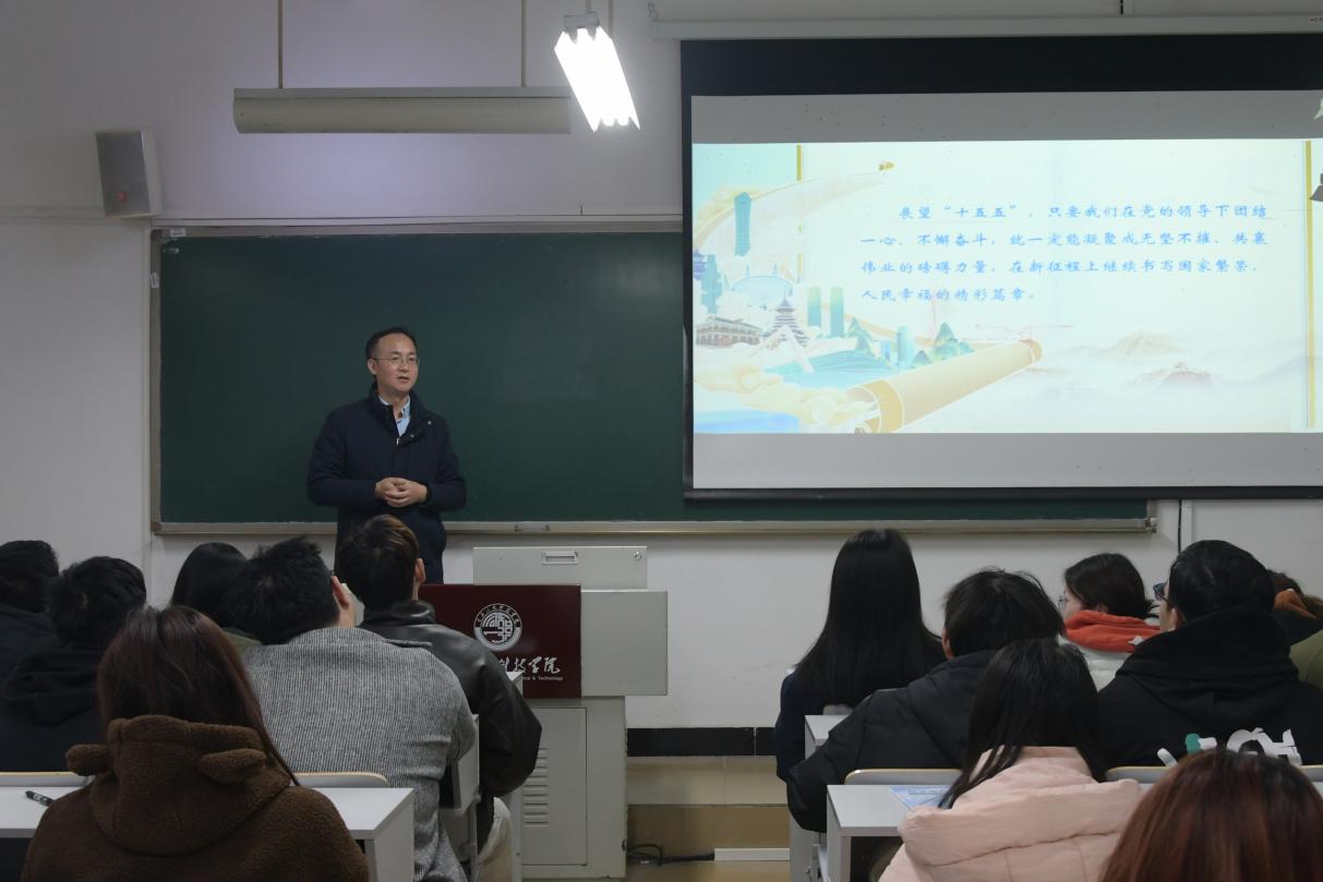 为帮助学生系统了解“十四五”时期的重要成就,准确把握“十五五”规划的战略方向,12月9日,重庆人文科技学院校长助理双海军教授走进管理学院课堂,为2025级供应链管理1班师生讲授专题思政课,以翔实的数据和深入的政策分析引导学生理解中国式现代化的整体布局与发展逻辑。